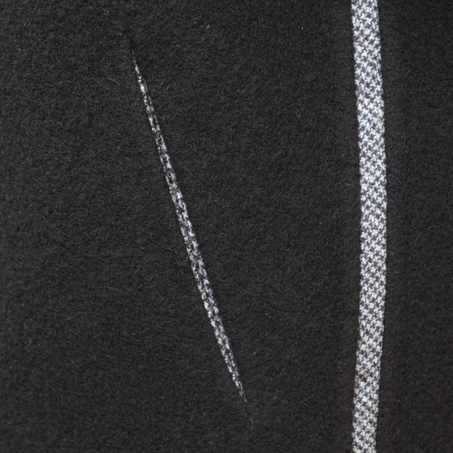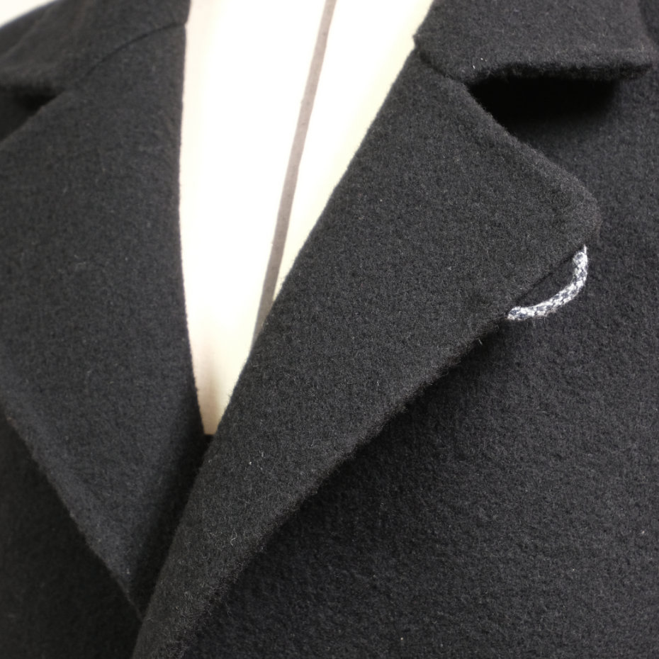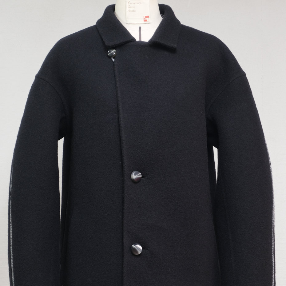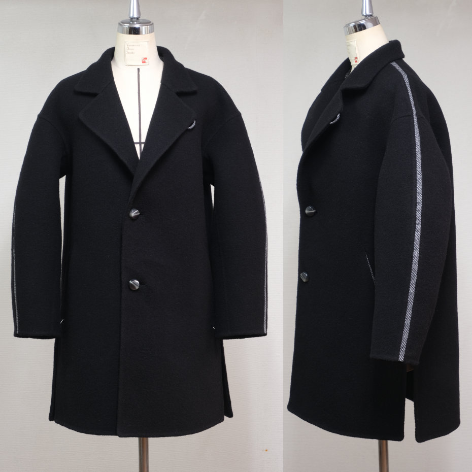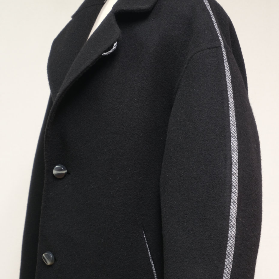 黒のダブルフェイス地とチェック生地を組み合わせたコートは、シンプルな中に個性的なシルエットと、細部にこだわったデザイン。