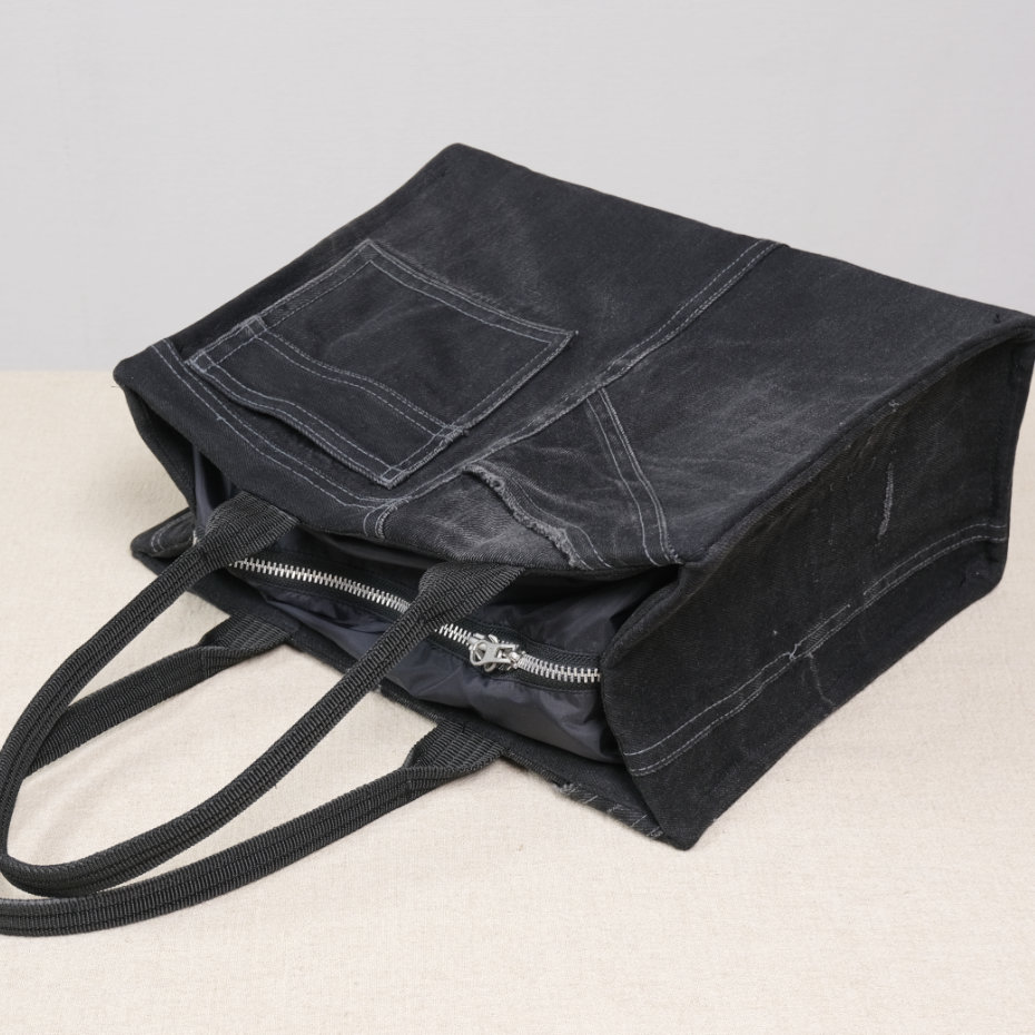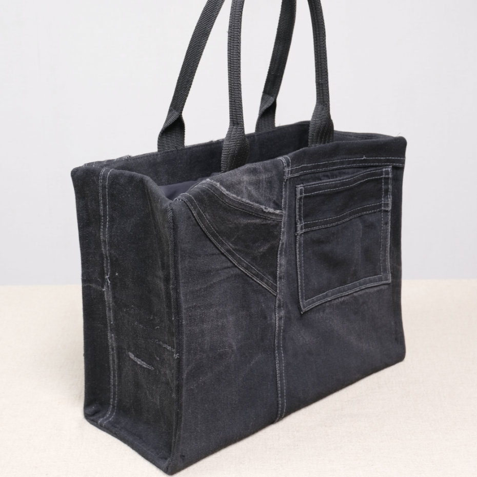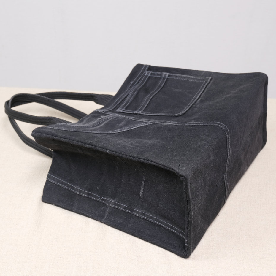 ポケットのデザインを有効に活かした、トートバッグに仕立てました。