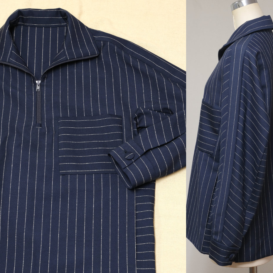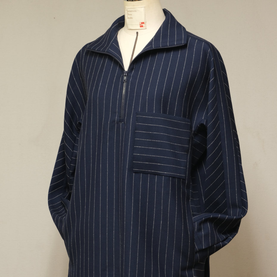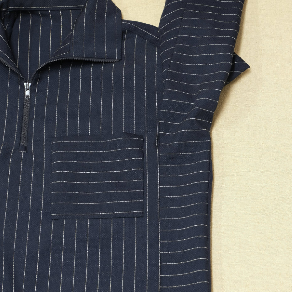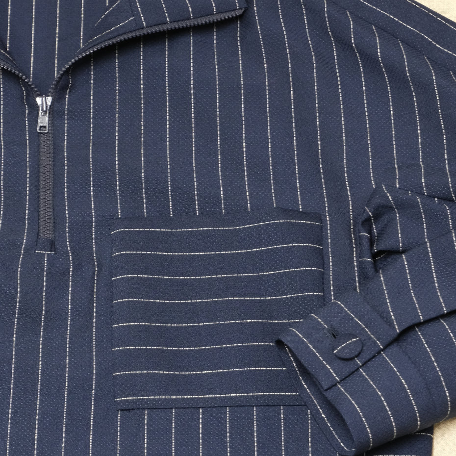 機能性が求められる服に用いられる構造を、ストライプを活かしたデザインです。
