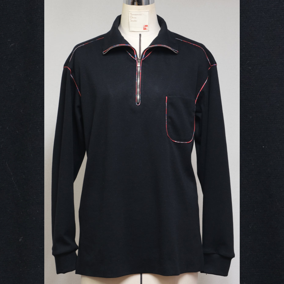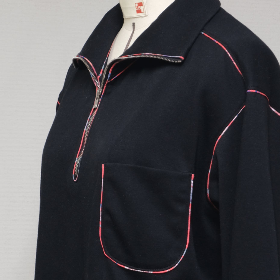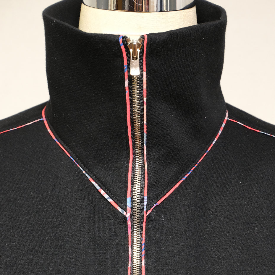 今回の作品は、このファスナーの取り付け方から全体のデザインに展開してもので、良な綿ジャージの生地に綿のプリント生地を組み込みました。