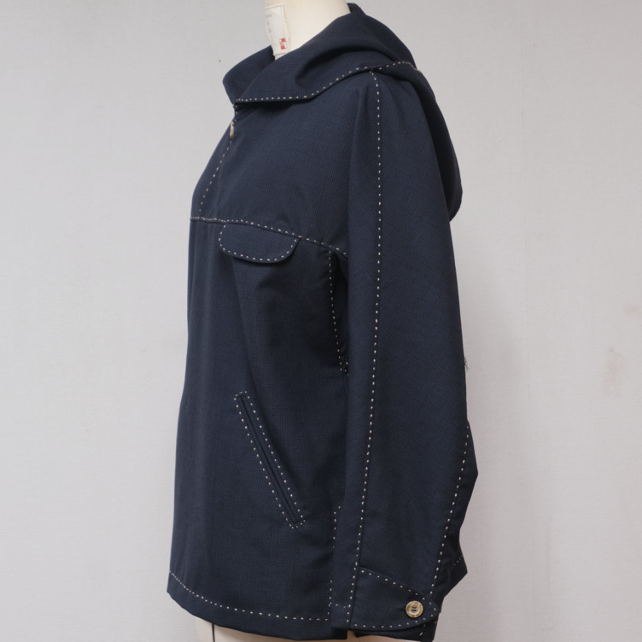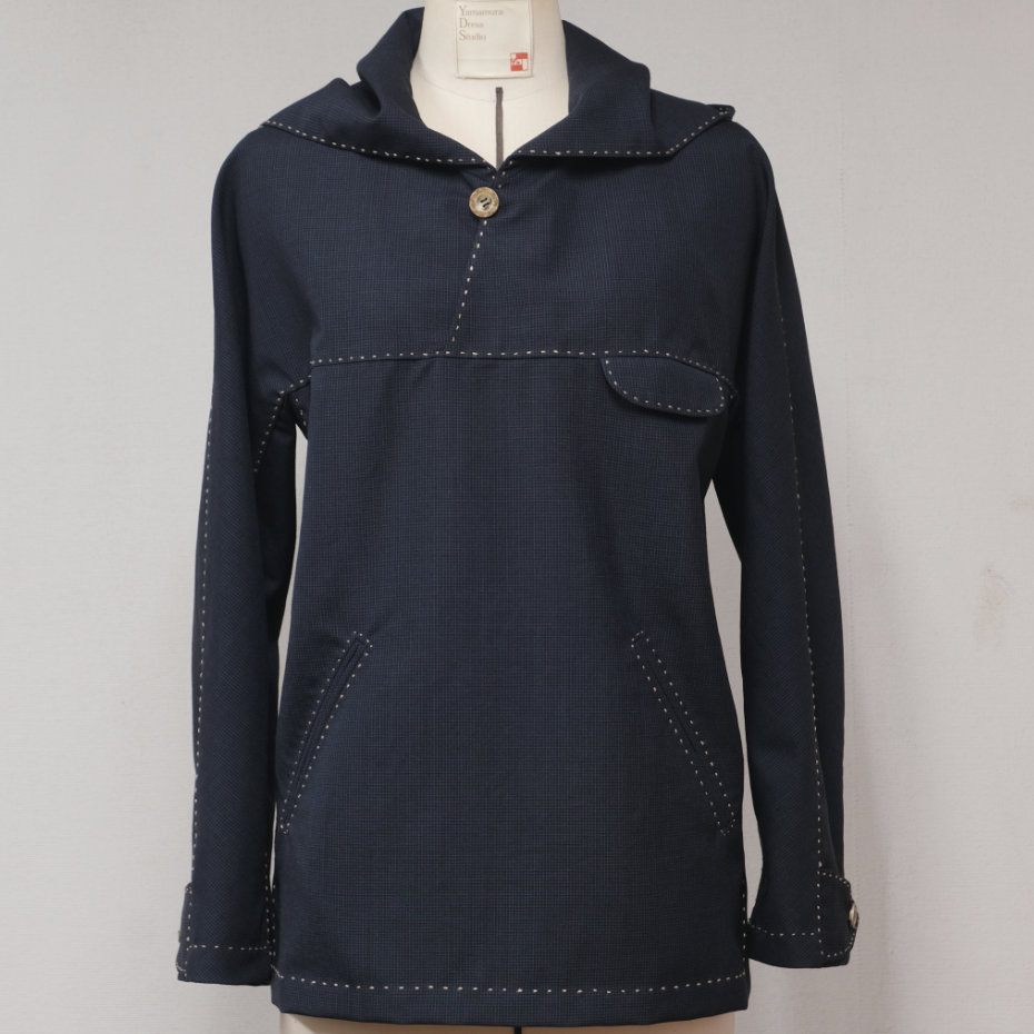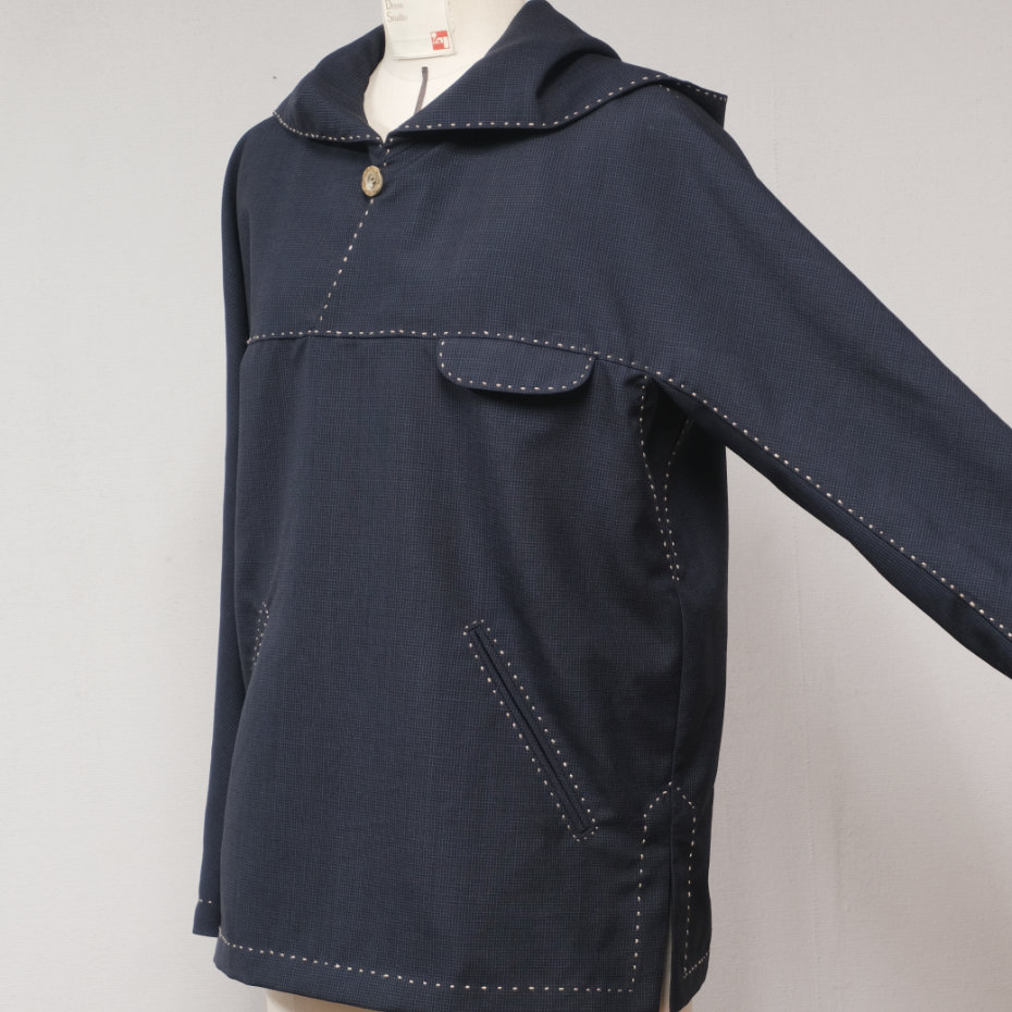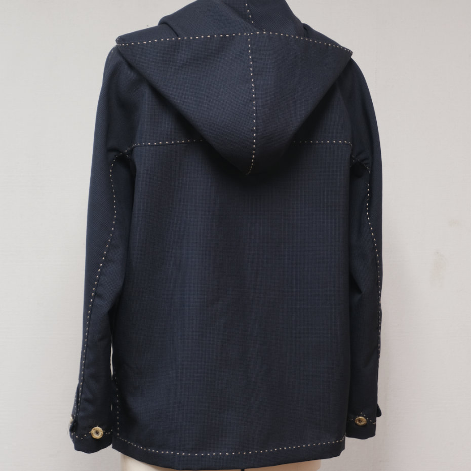 ハンドステッチをふんだんに施した、フード付きのシャツは、紳士服スーツ用につくられたウール素材を用いました。