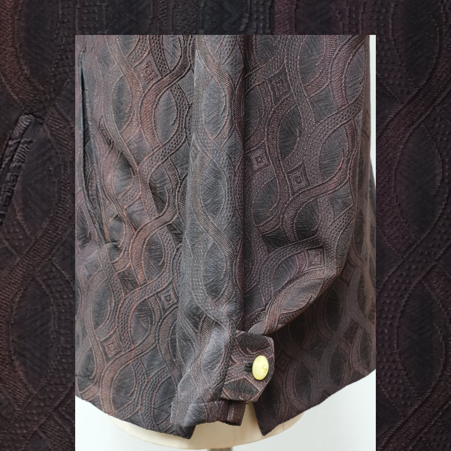 既にある、着物(着物地)の活用は、いつも考えているテーマの一つです。 「活用」をキーワードにするなら、「特別な日」の装いも良いけど、むしろいかに普段使いができるかが重要で、そこには取り扱いの手間があまりかからないこと、という要素も含まれます。 これは、古い着物地から仕立てましたが、一度水通しをしてから、カジュアルにも着こなせるデザインにしました。