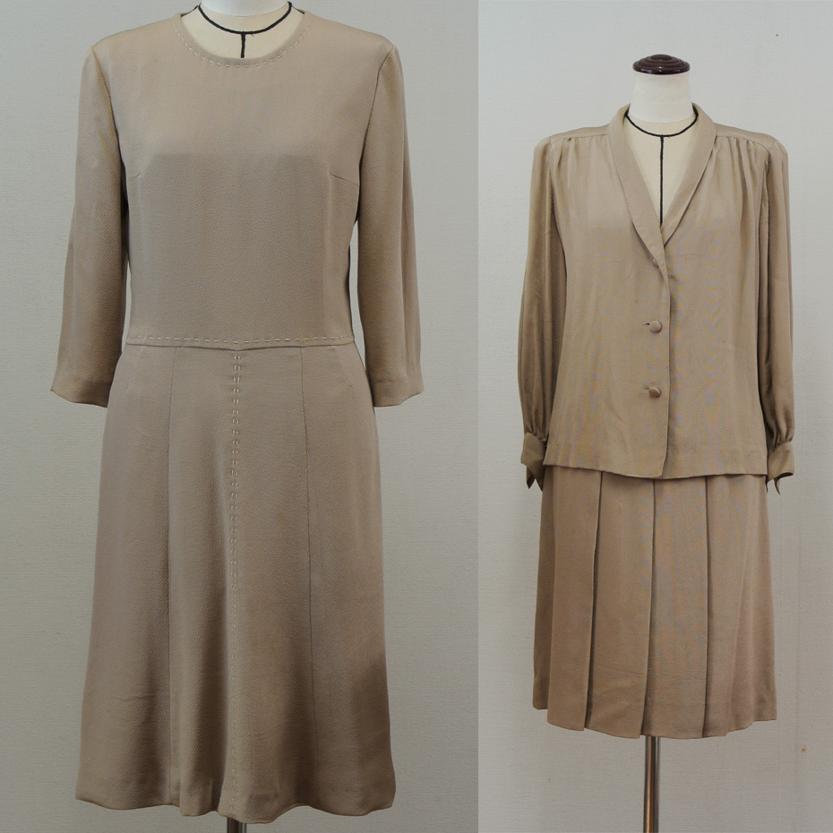 肩や袖口のギャザーの入ったブラウスジャケットと、プリーツスカートのスーツを、ワンピースにリメイク。