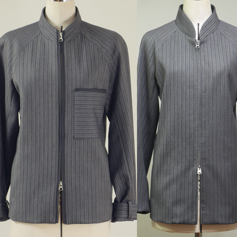 ファスナー部分とポケットに黒い生地を合わせ、襟のカーブを変更し、丈を短くし、袖口に飾り付けを施し、全体的にカジュアルな雰囲気にリフォームしました。
