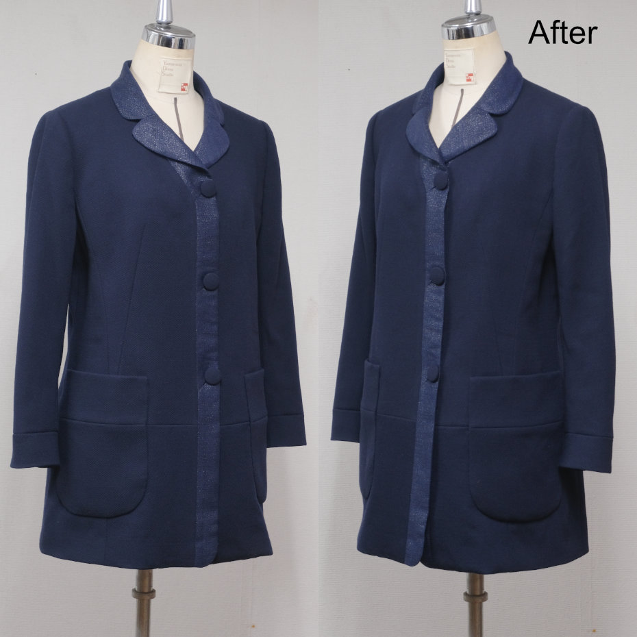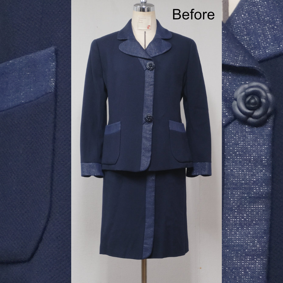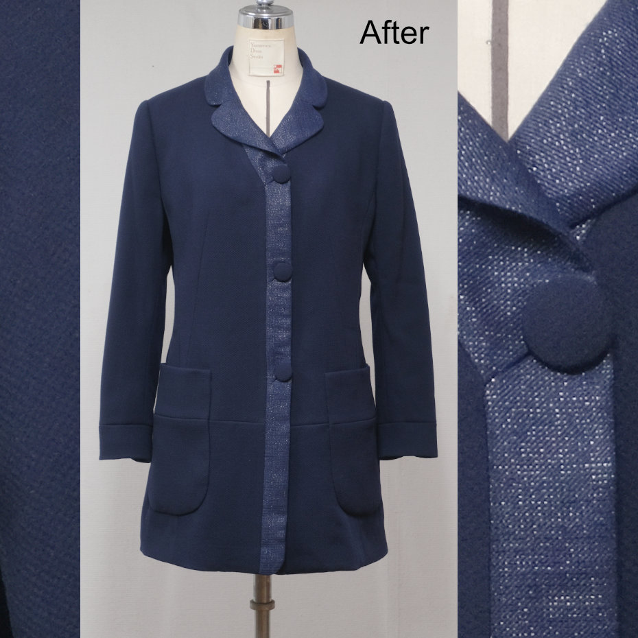 「丈を長くしたい」「襟を小さくしたい」「袖口の生地を替えたい」ことはお客さまご要望で、丈の追加分は、スカートの生地と、他にも少し残ってい生地を活用。バランスを考え、ポケットの作り直し、長くした丈との兼ね合いで、2つボタンを3つボタンにするため、前身頃のサテンの部分の修正と作り直し、写真では分かりにくいでしょうけど、肩パッドを外し、全体のシルエットも微調整、袖を付け直した大改造です。