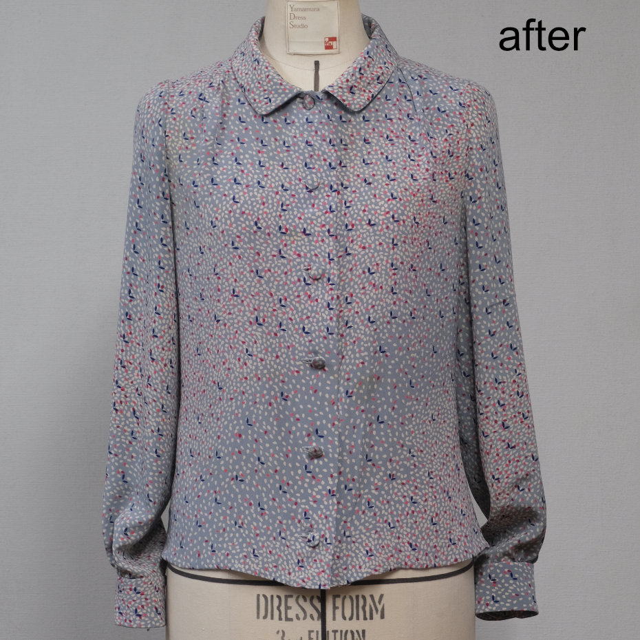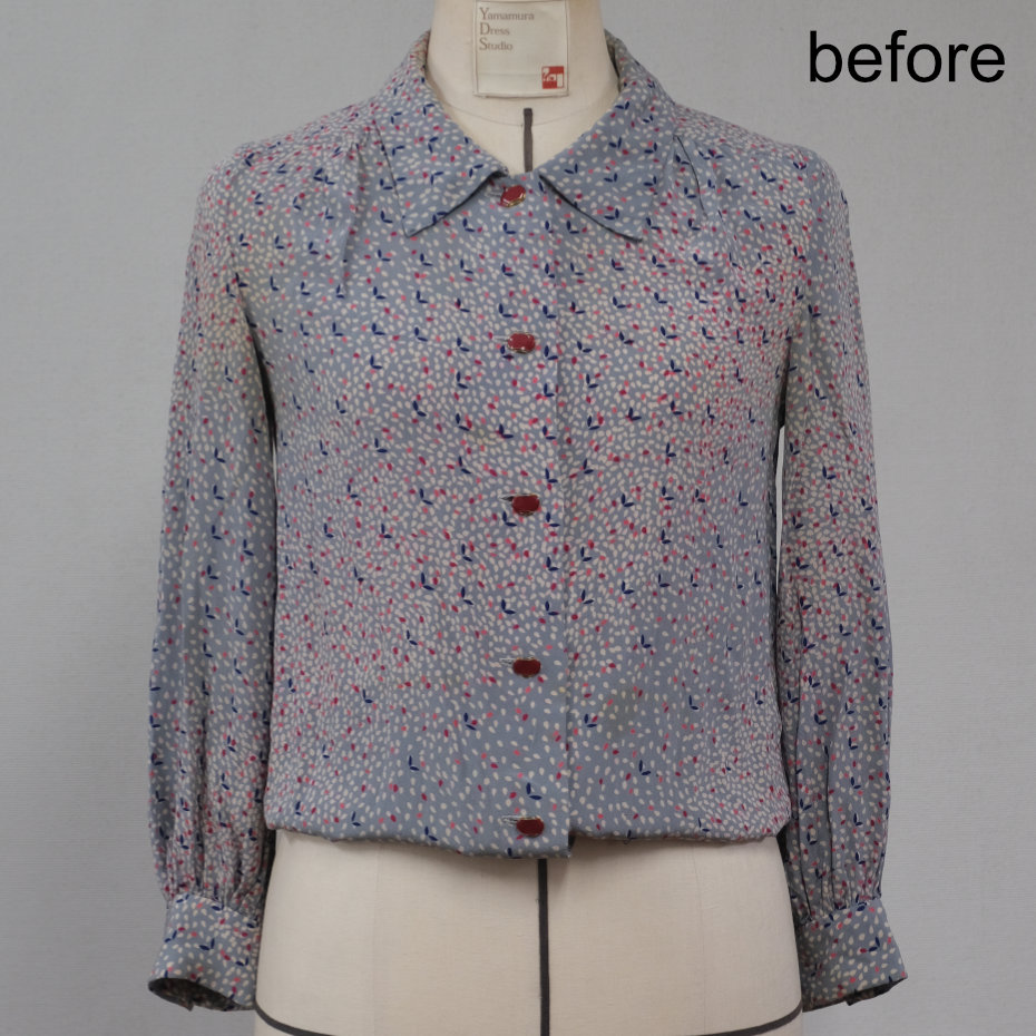 元々はセットアップで、スカートもあったので、その生地を使い、脇の部分に部品を追加してシルエットの変更、袖と袖口の作り替えによる、分量の調節に加えて、襟の作り替え、ボタンをくるみボタンに付け替えることによって、全体の雰囲気を変更しました。
