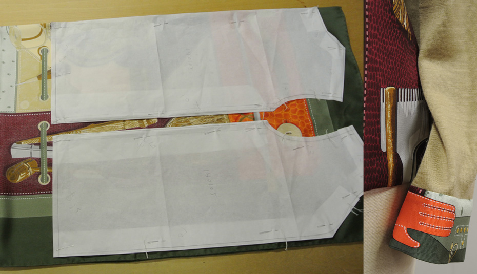 スカーフの柄のどの部分をどこに使うか?何色のジャージを合わせるか?限られた生地の中で、どのように組み合わせるかがポイントです。