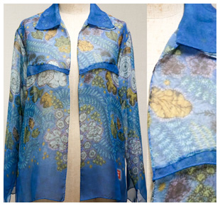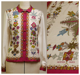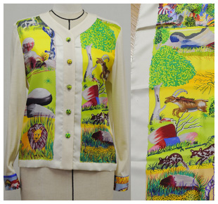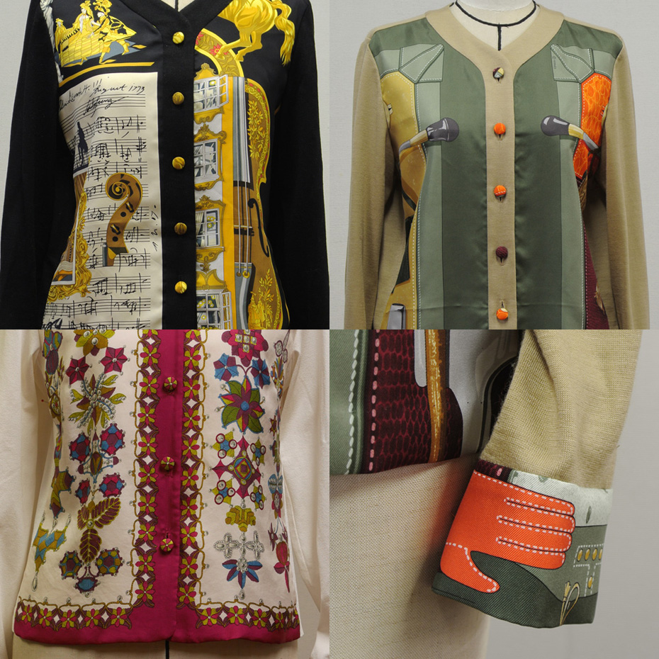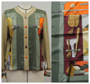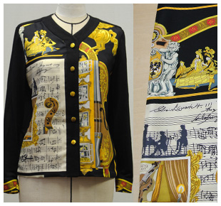 ● スカーフのリメイクは、プリントをどのように配置し、活かすかが大切なポイントです。 洋服の形が同じだとしても、配置の仕方はプリントによって違ってくるので、毎回それぞれの工夫があります。 左上のスカーフの中心は、右身頃下の五線譜の部分で、もとのプリントに対してアシンメトリーに配置。 左下は、スカーフの周辺部分を前立てから裾に、そのまま流用。ちなみに、衿とカフスにも、周辺のピンクの部分を用いました。 右は、スカーフの周辺の緑色の部分を、前端から肩にかけて、「T」の字に活用、プリントにあった手袋のモチーフをカフスに用いました。
